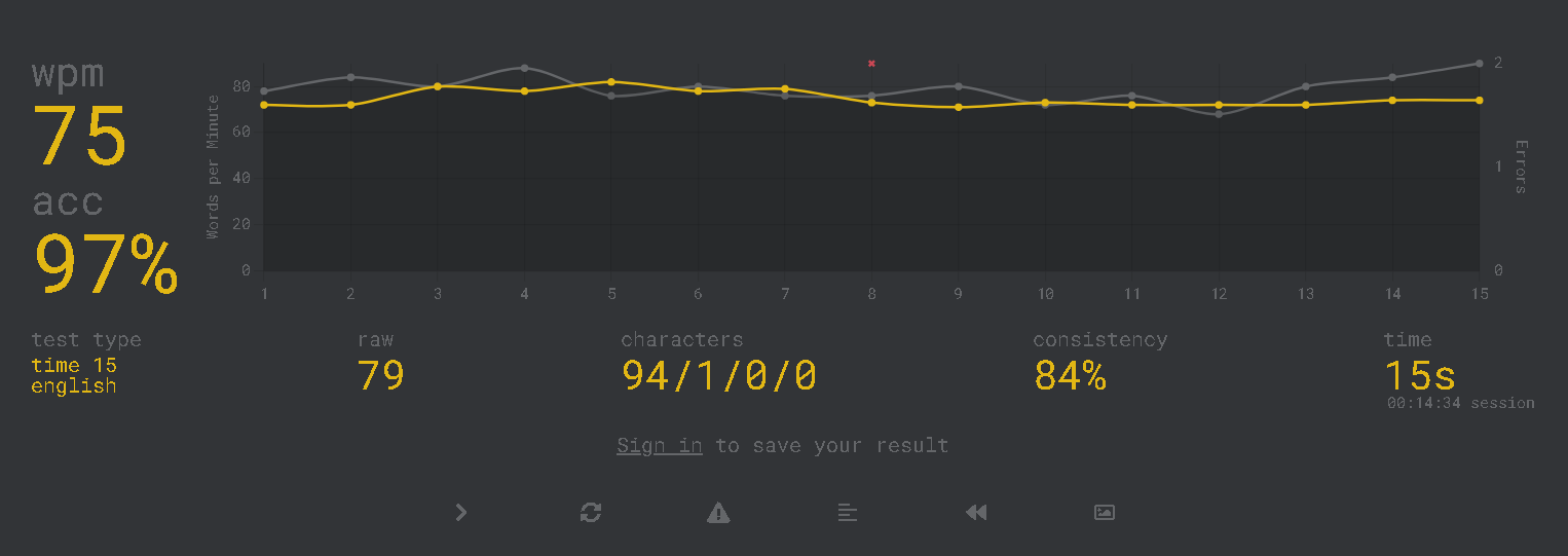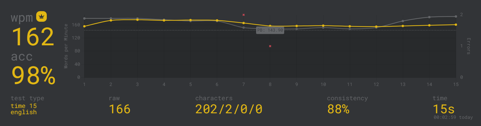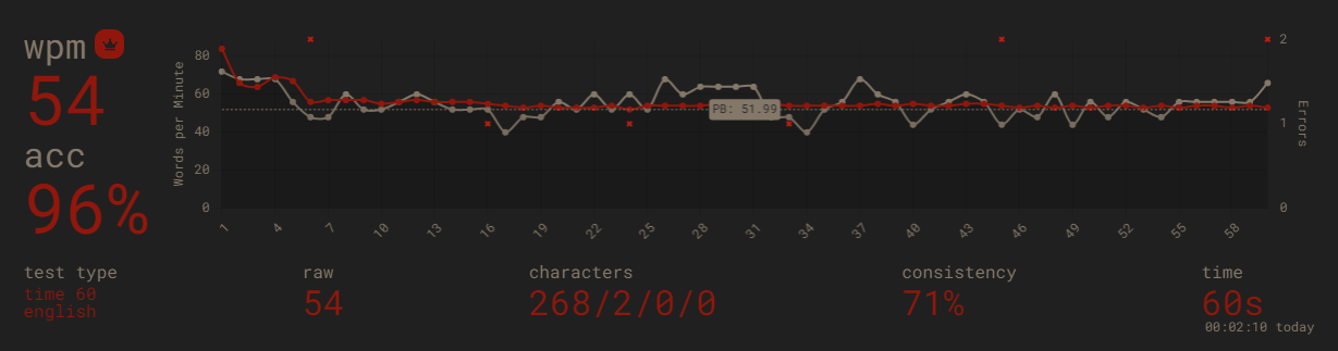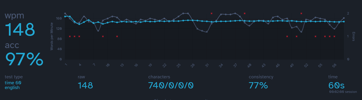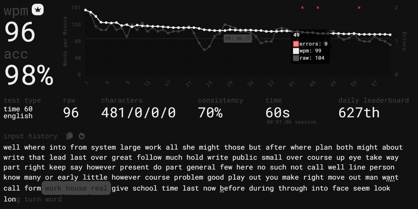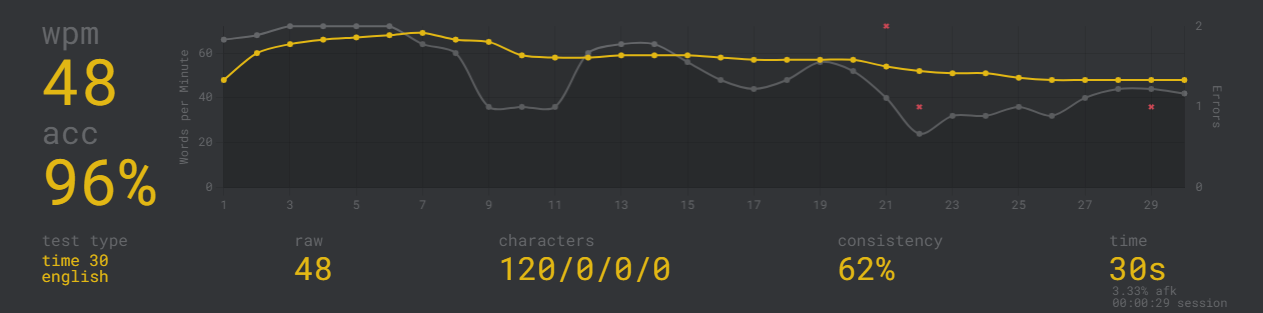 179bpm - 30 seconds - 48 WPM (Accuracy - 96%)