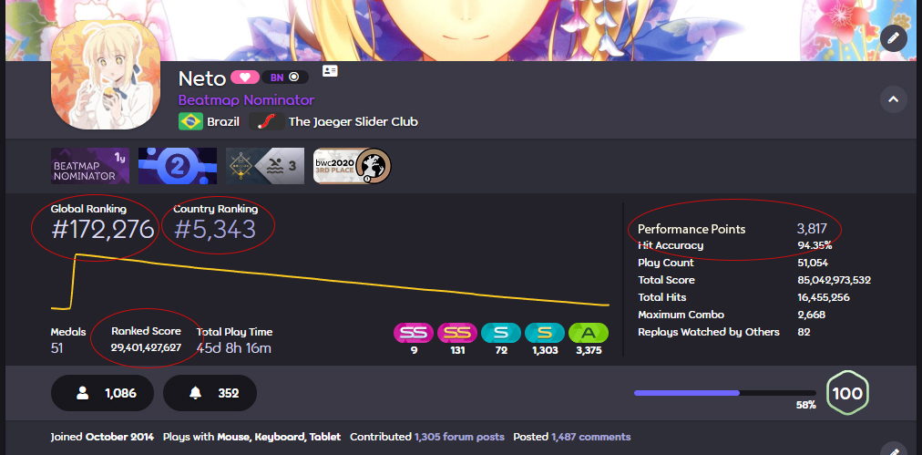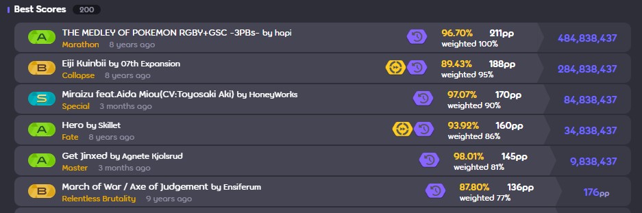 - The "Best Performance" section on profiles (showing either top pp plays or top ranked scores)